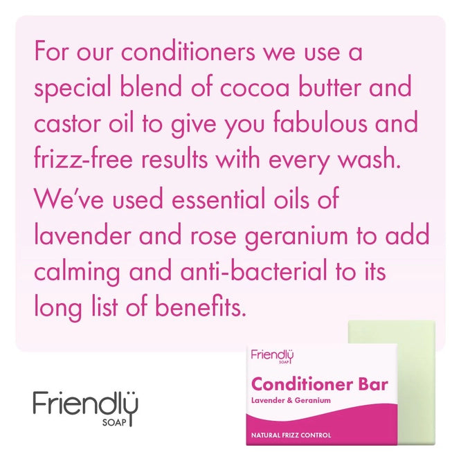 Our conditioner bars are a special blend of cocoa butter and castor oil to give you fabulous and frizz-free results with every wash. Each conditioner bar is handmade using essential oils of Lavender and Rose Geranium to add calming and anti-bacterial to its long list of benefits.